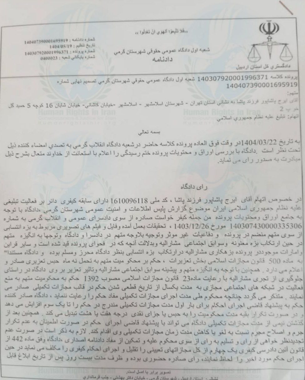 براساس دادنامه صادره توسط قاضی شعبه دادگاه عمومی شهرستان گرمی؛ ایرج پاشاپور، از بابت اتهام «تبلیغ علیه نظام جمهوری اسلامی» به تحمل ۹ ماه حبس تعزیری و بعنوان مجازات تکمیلی هم به ۱ سال منع فعالیت در شبکه های اجتماعی و فضای مجازی» محکوم شد.