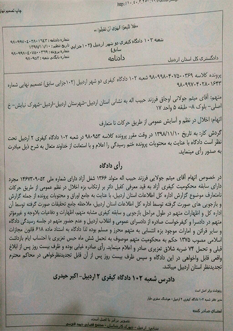 براساس دادنامه صادره توسط ۱۰۲ دادگاه کیفری ۲ اردبیل میثم جولانی از بابت اتهام”اخلال در نظم عمومی از طریق حرکات نامتعارف موضوع گزارش اداره کل اطلاعات استان اردبیل” به تحمل ۶ماه حبس تعزیری و ۷۴ ضربه شلاق محکوم شد”.