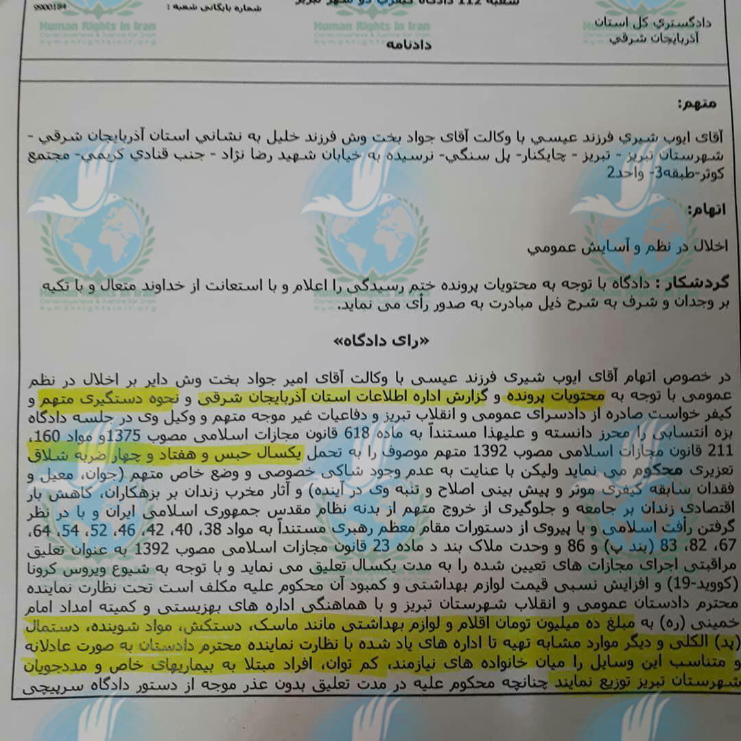 به گزارش حقوق بشر در ایران, روز دوشنبه ۹ تیر ماه ۱۳۹۹, ایوب شیری, فعال ملی مدنی ساکن تبریز و از بازداشت شدگان اعتراضات آبان ماه ۱۳۹۸, توسط شعبه ۱۰۲ دادگاه کیفری ۲ تبریز از بابت اتهام اخلال در نظام و آسایش عمومی به تحمل ۱ سال حبس و ۷۴ ضربه شلاق با طول مدت تعلیق ۱ ساله محکوم شد. این فعال ملی مدنی همچنین به تهیه اقلام بهداشتی معال مبلغ ۱۰ میلیون تومان برای افراد نیازمند محکوم شد. این حکم در مرحله بدوی صادر شده و قابلیت تجدیدنظرخواهی دارد.