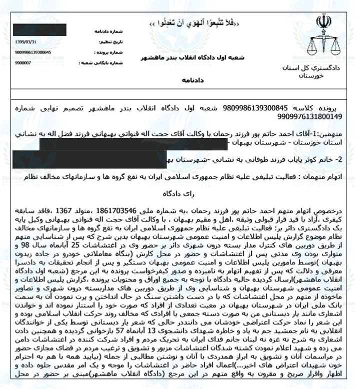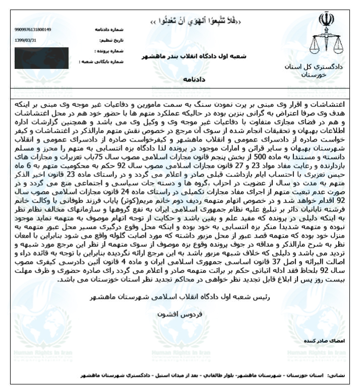 حقوق بشر در ایران – امروز شنبه ۲۸ تیر ماه ۱۳۹۹, شعبه ۱ دادگاه انقلاب بهبهان به ریاست فردوس افشون با صدور دادنامه ای احمد حاتم پور, شهروند ساکن شهرستان ماهشهر و از بازداشت شدگان اعتراضات آبان ماه ۱۳۹۸ را در بخش اول پرونده قضائی وی به تحمل ۶ ماه حبس تعزیری و مجازات تکمیلی محکوم کرد. شعبه ۱۰۱ دادگاه کیفری ۲ بهبهان با ارسال پیامکی احمد حاتم پور را برای حضور در جلسه دادرسی در بخش دوم این پرونده فراخواند. همچنین مریم پایاب دیگر متهم این پرونده نیز از کلیه اتهامات تبرئه شد.