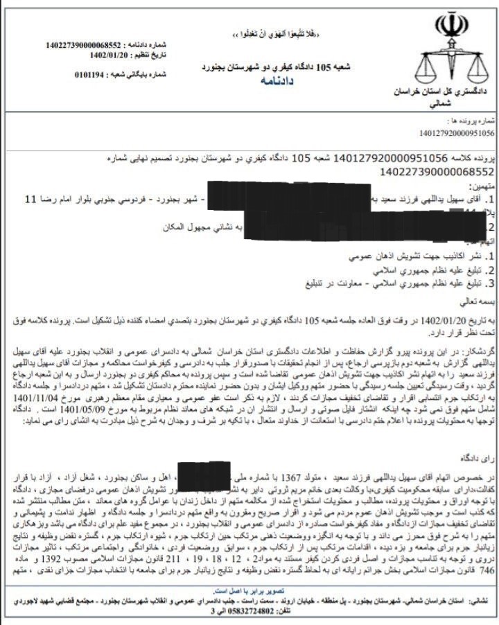حقوق بشر در ایران ـ امروز سه شنبه ۲۲ فروردین ماه ۱۴۰۲، یزدانعلی ایزانلو، قاضی شعبه ۱۰۵ دادگاه کیفری ۲ شهر بجنورد مرکز استان خراسان شمالی، با صدور دادنامه ای سهیل یداللهی را به جریمه نقدی محکوم کرد.