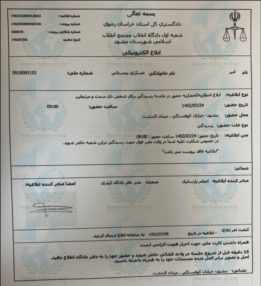لازم به اشاره است، امیر عسکری بجستانی، در تاریخ ۲۹ شهریور ماه ۱۴۰۲، ابلاغیه ای کتبی را از سوی مهدی عالی نژاد، بازپرس شعبه ۹۰۲ دادسرای عمومی و انقلاب مشهد، دریافت کرد و سپس در جلسه بازپرسی و تفهیم اتهام حاضر و در انتهای جلسه بازپرسی با تودیع قرار کفالتی به مبلغ ۲۷ میلیون تومان، تا اتمام مراحل دادرسی آزاد شد.