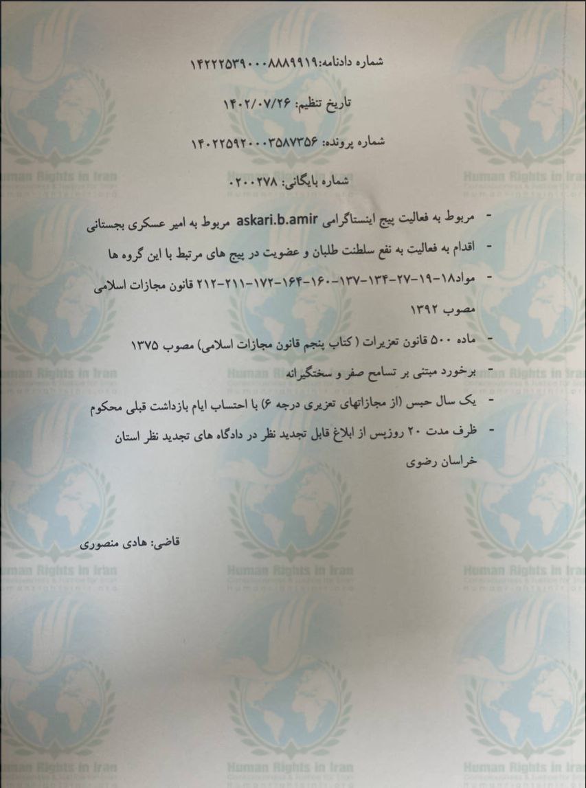 به گزارش حقوق بشر در ایران، روز چهارشنبه ۲۶ مهر ماه ۱۴۰۲، امیر عسکری بجستانی، فعال فضای مجازی (اینستاگرام)، ساکن شهر مشهد مرکز استان خراسان رضوی، توسط قاضی هادی منصوری ـ رئیس شعبه اول دادگاه انقلاب مشهد، به تحمل ۱ سال حبس تعزیری محکوم شد.