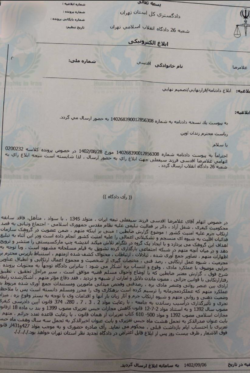 حقوق بشر در ایران – امروز چهارشنبه ۸آذر ماه ۱۴۰۲، غلامرضا اقدسی، توسط ایمان افشاری به تحمل حبس تعزیری محکوم شد.