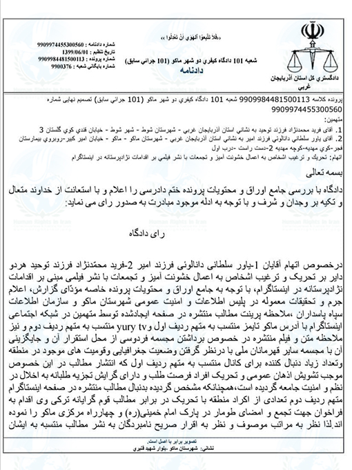 حقوق بشر در ایران – امروز یکشنبه ۲ شهریور ماه ۱۳۹۹, شعبه ۱۰۱ دادگاه کیفری۲ شهرستان ماکو با صدور دادنامه ای یاور سلطانی و فرید محمدنژاد, دو فعال رسانه ای و از گردانندگان صفحه اینستاگرامی ماکو تایمز و یورت تی وی را در مجموع به تحمل ۲ سال حبس تعزیری محکوم کرد.