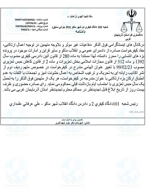 بنقل از یک منبع مطلع در گفتگو با گزارشگر حقوق بشر در ایران ضمن اعلام این خبر گفت: “دیروز شنبه ۱ شهریور ۱۳۹۹ طبق دادنامه ای از طرف شعبه ۱۰۱ دادگاه کیفری ۲ ماکو به ریاست علی عرفانی علمداری با صدور دادنامه ای یاور سلطانی خبرنگار و مدیر صفحه اینستاگرامی “ماکو تایمز” و فرید محمد نژاد مدیر صفحه اینستاگرامی”یورت تی وی” به اتهام “تحریک و ترغیب افراد به اعمال خشونت آمیز و تجمعات با نشر فیلمی بر اقدامات نژادپرستانه در اینستاگرام” هر یک از این شهروندان ساکن ماکو را به تحمل ۱ سال حبس تعزیری محکوم کرد”.