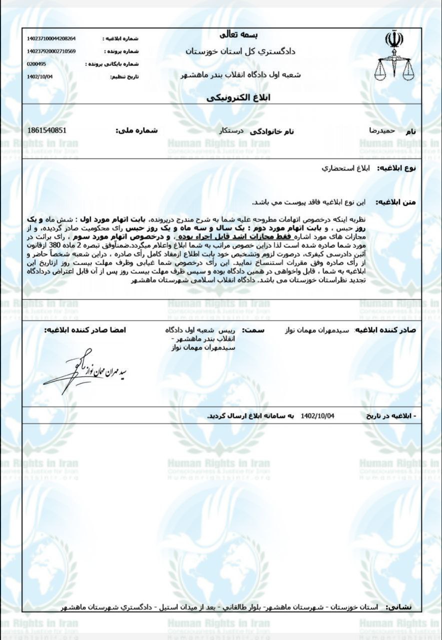 حقوق بشر در ایران ـ امروز پنجشنبه ۷دی ماه ۱۴۰۲، حمیدرضا درستکار، توسط قضات شعبه ۱۰۱ و ۱۰۳ دادگاه کیفری ۲ بهبهان و قاضی شعبه اول دادگاه انقلاب ماهشهر، به حبس تعزیری و پرداخت جزای نقدی محکوم شد.