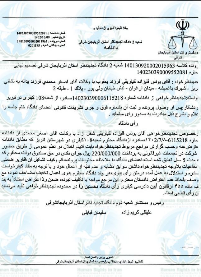 حقوق بشر در ایران ـ امروز دوشنبه ۱۱دی ماه ۱۴۰۲، یونس قلیزاده، توسط قاضی شعبه ۲ دادگاه تجدیدنظر استان آذربایجان شرقی به پرداخت جریمه نقدی محکوم شد.