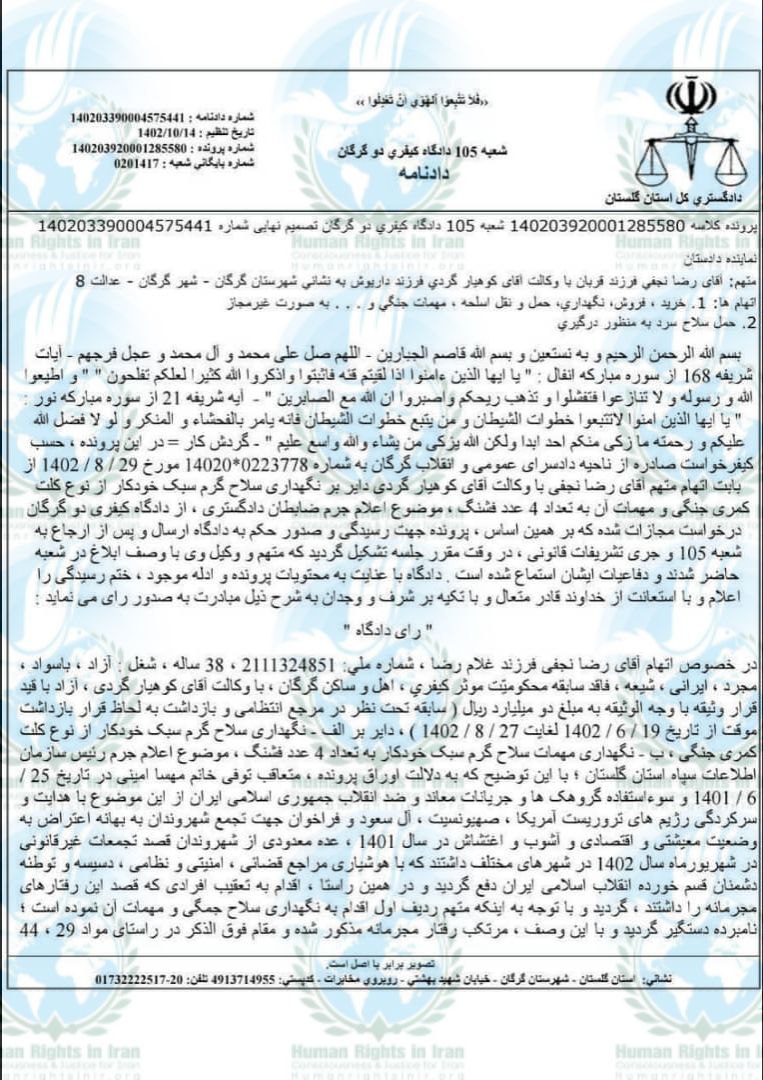 براساس دادنامه صادره در تاریخ ۱۴ دی ماه ۱۴۰۲ که امروز سه شنبه به کوهیار گُردی ـ وکیل مدافع متهم این پرونده ابلاغ شده؛ رضا نجفی از بابت اتهام (خرید، فروش، نگهدای، حمل و نقل اسلحه، مهمان جنگی و غیره بصورت غیرمجاز) به تحمل ۴ سال حبس تعزیری و به اتهام (حمل سلاح سرد به منظور درگیری) هم به تحمل ۴ سال حبس تعزیری محکوم شد.