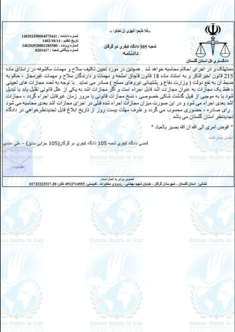 حقوق بشر در ایران ـ امروز سه شنبه ۱۹دی ماه ۱۴۰۲، رضا نجفی، توسط قاضی شعبه ۱۰۵ دادگاه کیفری۲ گرگان به حبس تعزیری محکوم شد.