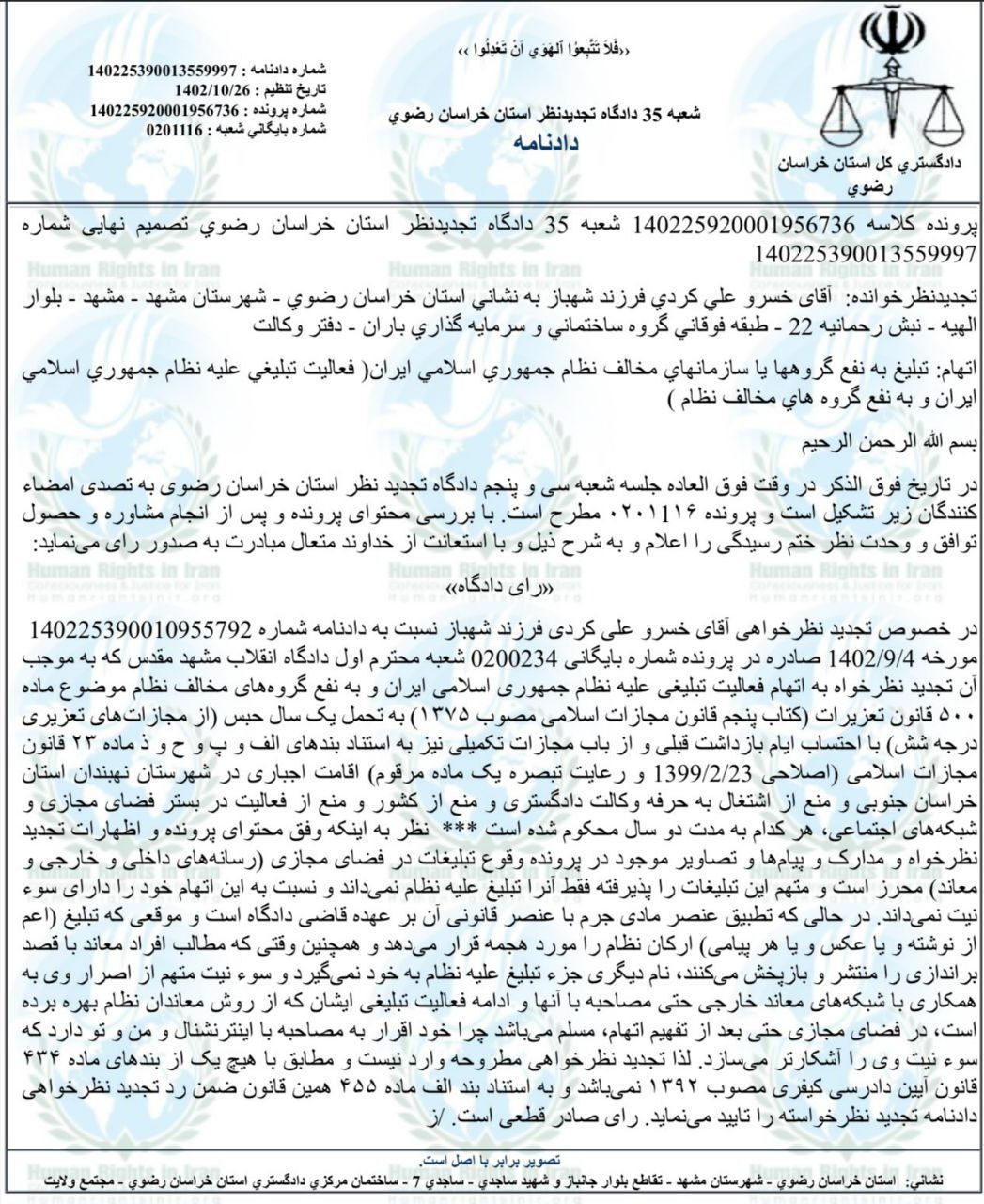 به گزارش حقوق بشر در ایران، روز سه شنبه ۲۶ دی ماه ۱۴۰۲۷ خسرو علیکردی، فرزند: شهباز، وکیل دادگستری، ساکن مشهد، توسط قضات شعبه ۳۵ دادگاه تجدیدنظر استان خراسان رضوی، در مجموع به تحمل ۱ سال حبس تعزیری، دو سال منع خروج از کشور، دو سال تبعید به شهرستان نهبندان، دو سال محرومیت از وکالت و تعلیق مجوز وکالت و به ۲ سال منع فعالیت در فضای مجازی، محکوم شد.
