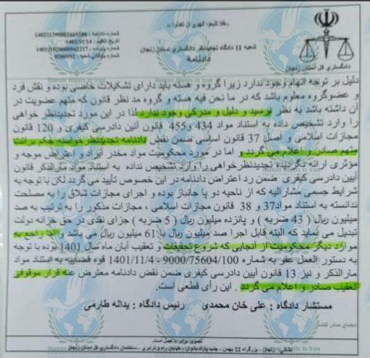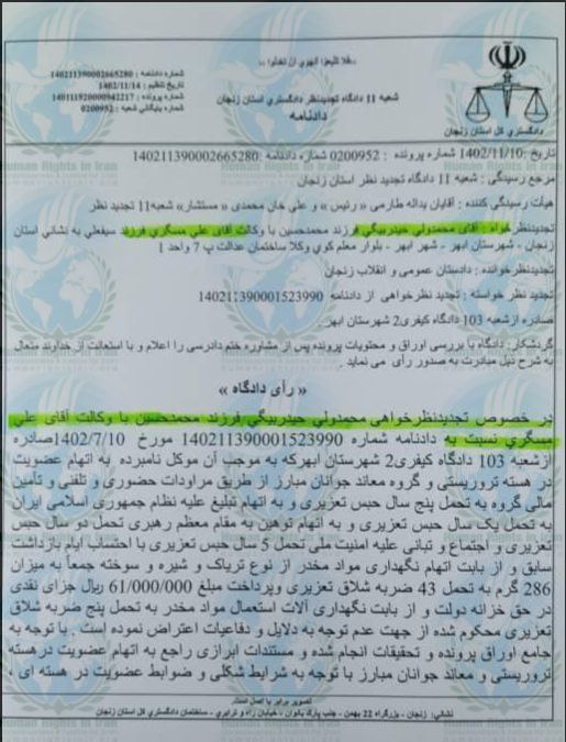 لازم به اشاره است، محمدولی حیدربیگی، در تاریخ ۴ بهمن ماه ۱۴۰۲، توسط قاضی طارمی و مستشار علی خان محمدی ـ در شعبه ۱۱ دادگاه تجدیدنظر استان زنجان، ازبابت اتهامات (عضویت در جمعیتهای معارض کشور)، (همکاری با دووَل خارجی متخاصم علیه نظام جمهوری اسلامی از طیق افراد مستقر در آمریکا و انگلیس)، (توهین به رهبری در فضای مجازی)، (نگهداری موادمخدر)، (تبلیغ علیه نظام در فضای مجازی)، (اجتماع و تبانی برای ارتکاب جرم علیه امنیت ملی)محاکمه شده بود.