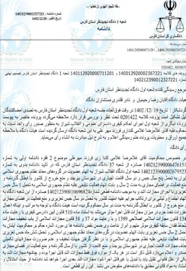 براساس دادنامه صادره؛ غلامرضا غلامی کندازی، توسط رضا رحیمیان و نادر قلندری ـ مستشاران شعبه اول دادگاه تجدیدنظر استان فارس، از بابت اتهام (عضویت در گروههای معاند نظام) به تحمل ۲ سال حبس تعزیری و به اتهام (فعالیت تبلیغی علیه نظام) هم به تحمل ۶ ماه حبس تعزیری، محکوم شد.