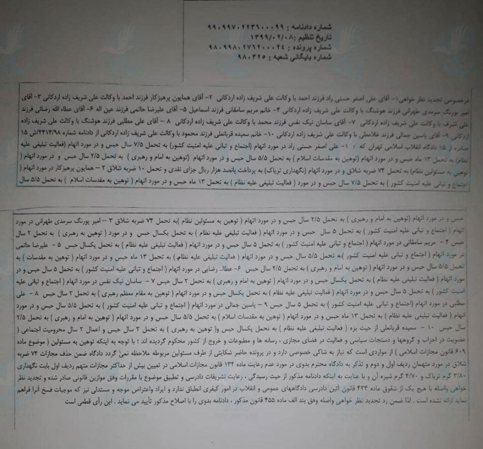 این منبع مطلع در ادامه پیرامون چرائی عدم تشکیل جلسه دادرسی افزود: ” پس از ابلاغ احکام این افراد توسط شعبه ۱۵ دادگاه انقلاب تهران توسط ابوالقاسم صلواتی علی شریف زاده اردکانی که وکالت علی اصغر حسنی راد, همایون پرهیزگار, امیرپورنگ سرمدی, مریم سامقانی, علیرضا حاتمی, عطالله رضائی, ساسان نیک نفس, علی مطلبی, هشت نفر از ۱۰ متهم این پرونده را به عهده داشت دفاعیه ای در ۱۵ صفحه تنظیم و به شعبه دادگاه تحویل داده بود و صدور حکم با استناد به ماده ۴۵۰ از قانون مجازات اسلامی که “برعدم ضرورت تشکیل جلسه تجدیدنظر با حضور متهم و وکیل مدافع وی تاکید می کند” توسط شعبه ۳۶ دادگاه تجدیدنظر استان تهران صورت گرفت.