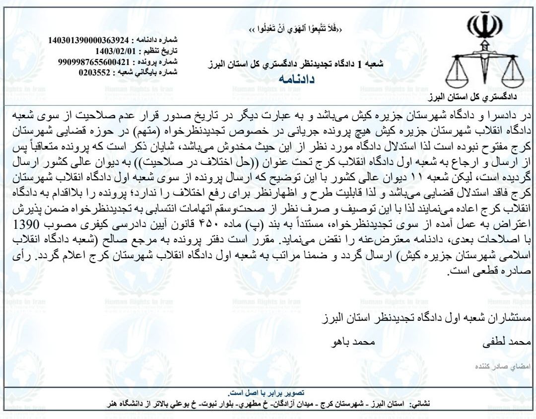 حقوق بشر در ایران ـ امروز چهارشنبه ۵اردیبهشت ماه ۱۴۰۳، حکم صادره بدوی بر علیه منوچهر بختیاری، توسط قاضات شعبه ۱دادگاه تجدیدنظر استان البرز نقض شد.