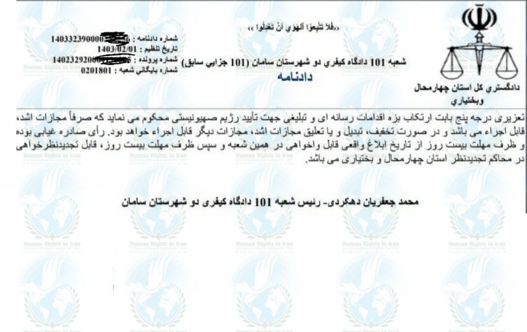 به گزارش حقوق بشر در ایران، روز شنبه ۱ اردیبهشت ماه ۱۴۰۳، امید ایزدی صادق آبادی، فرزند بهرامعلی، مجرد، متولد: ۱۳۶۷، توسط قاضی محمدجعفریان دهکردی ـ رئیس شعبه ۱۰۱ دادگاه کیفری۲ شهرستان سامان، به تحمل ۴ سال حبس تعزیری و پرداخت ۱۵۰ میلیون تومان جریمه نقدی محکوم شد.