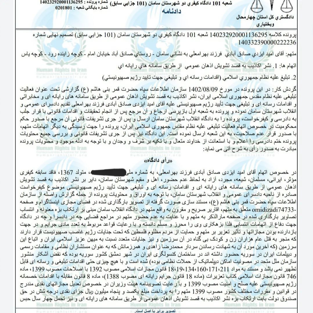 حقوق بشر در ایران ـ امروز جمعه ۷ اردیبهشت ماه ۱۴۰۳، امید ایزدی صادق آبادی، به حبس و جریمه نقدی محکوم شد.