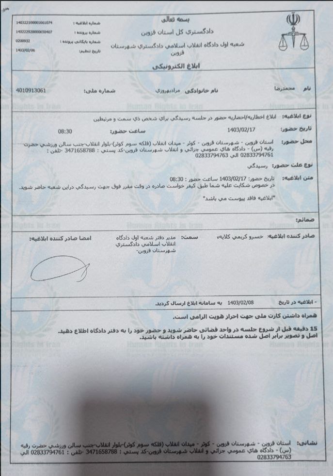 به نقل از یک فرد مطلع از وضعیت حقوقی پرونده محمدرضا مراد بهروزی، در گفتگو با گزارشگر حقوق بشر در ایران:”متهم این پرونده، در تاریخ ۶ اردیبهشت ماه ۱۴۰۳، ابلاغیه کتبی را برای حضور در جلسه دادرسی دریافت کرد و در تاریخ ۱۴ اردیبهشت ماه ۱۴۰۳، توسط قاضی شعبه اول دادگاه انقلاب قزوین، به اتهام (فعالیت تبلیغی علیه نظام از طریق انتشار مطالب در شبکه های اجتماعلی از قبیل اینستاگرام) محاکمه شده بود و یک روز بعد ابلاغیه صدور حکم برای محمدرضا مراد بهروزی ارسال شد و این فعال مدنی پس از حضور در دفتر شعبه اول دادگاه انقلاب قزوین، حکم خود را دریافت کرد.”