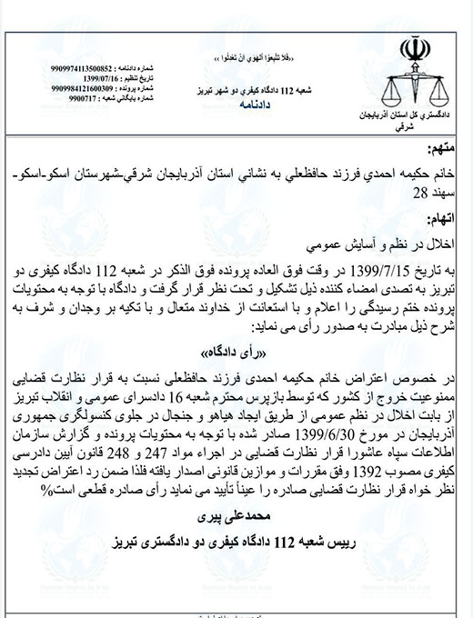 حقوق بشر در ایران – امروز جمعه ۱۸ مهر ماه ۱۳۹۹، شعبه ۱۱۲ دادگاه کیفری ۲ تبریز، به ریاست محمدعلی پیری، با صدور دادنامه ای حکیمه احمدی، فعال ملی مدنی را به ممنوع الخروجی محکوم کرد.