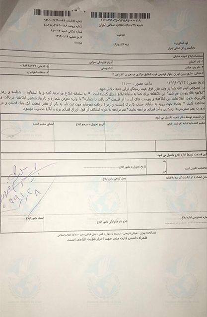 به گزارش حقوق بشر در ایران, روز پنجشنبه ۲۸ فروردین ماه ۱۳۹۹, احسان سرابی, شهروند ساکن تهران با توجه به احضاریه دریافتی توسط شعبه ۲۹ دادگاه انقلاب تهران جهت حضور در جلسه دادرسی به تاریخ ۱۳ اردیبهشت ماه سالجاری فراخوانده شد.