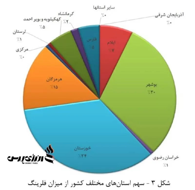 استان بوشهر با سهم ۲۰ درصدی و هرمزگان با سهم ۱۵ درصدی در رنبه های دوم و سوم رده بندی میزان فلرینگ قرار دارند.