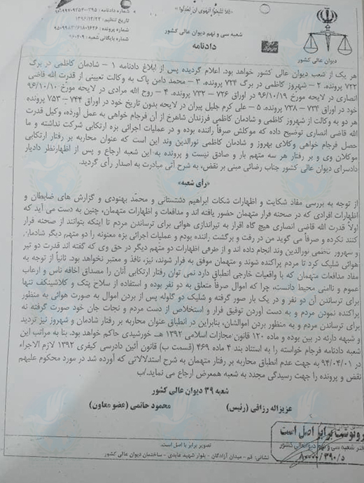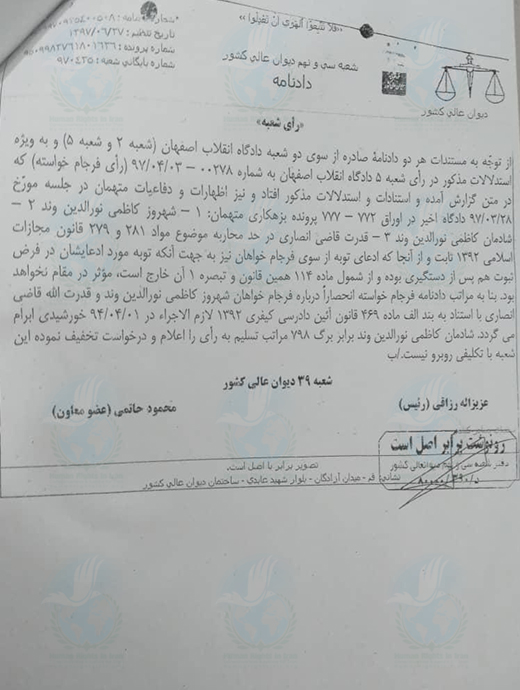 در تاریخ ۲۹ بهمن ماه ۱۳۹۸, سازمان عفو بین الملل, با انتشار گزارشی که به تفسیر موارد نقض حقوق بشر در ایران پرداخته بود در بخشی از این گزارش پیرامون صدور و اجرای احکام اعدام اعلام کرد: “حکم اعدام همچنان برای اعمالی در نظر گرفته شد که در قوانین بین المللی حقوق بشر مجاز به شمار میروند، اعمالی که از جمله شامل رابطه جنسی افراد همجنس با رضایت متقابل و روابط جنسی خارج از چارچوب زناشویی می شد؛ صدور حکم اعدام همچنین برای جرائمی از قبیل توهین به پیامبر اسلام , محاربه و افساد فی الارض, ادامه یافت که تعریف بسیار مبهمی دارند”.