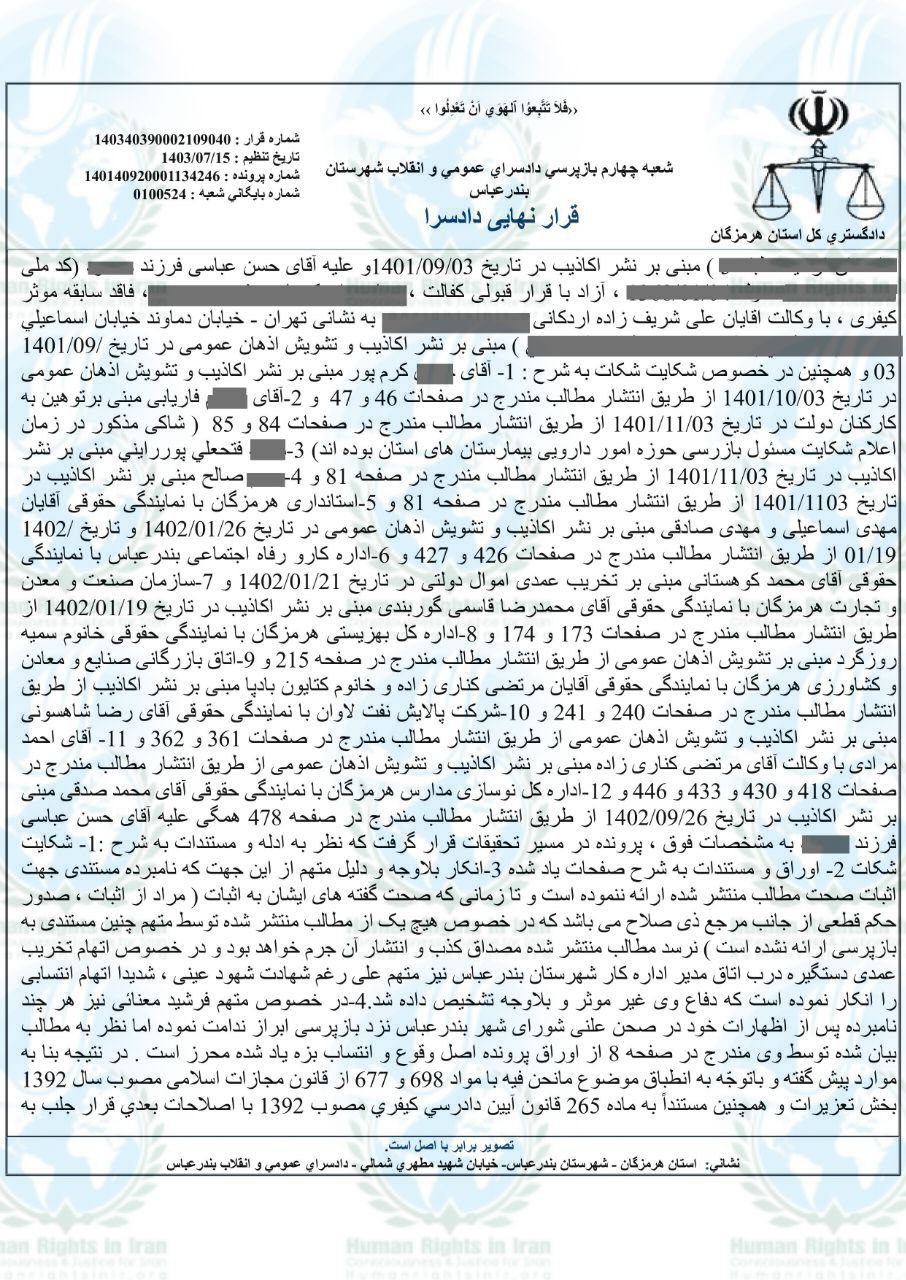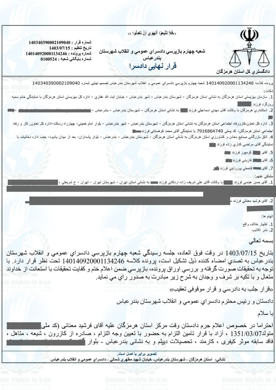همچنین، حسن عباسی، دیگر متهم این پرونده، در تاریخ ۲۵ شهریور ماه ۱۴۰۳ هم برای ارائه توضیحات نهایی خود در خصوص اتهامات «نشر اکاذیب در فضای مجازی» و «اخلال در نظم و آسایش عمومی»، «افترا» و «توهین به ماموران و مسئولان هنگام انجام وظیفه»، به شعبه ۴ بازپرسی دادسرای عمومی و انقلاب هرمزگان، احضار شده بود.