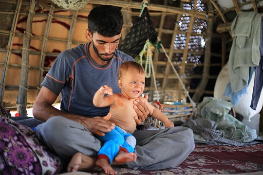 مرد ۶۰سالهای با صورتی بسیار سوخته از آفتاب به سمت ما می آید و او هم درد دارد و می نالد.پیراهن پسربچه ۹ سالهای را بالا میزند. از گلو تا شکم پسر دانه های تاول زده و زخم شده را نشان می دهد و می گوید: این سند مظلومیت ما را ثبت کن ببین گرما با ما چه می کند.