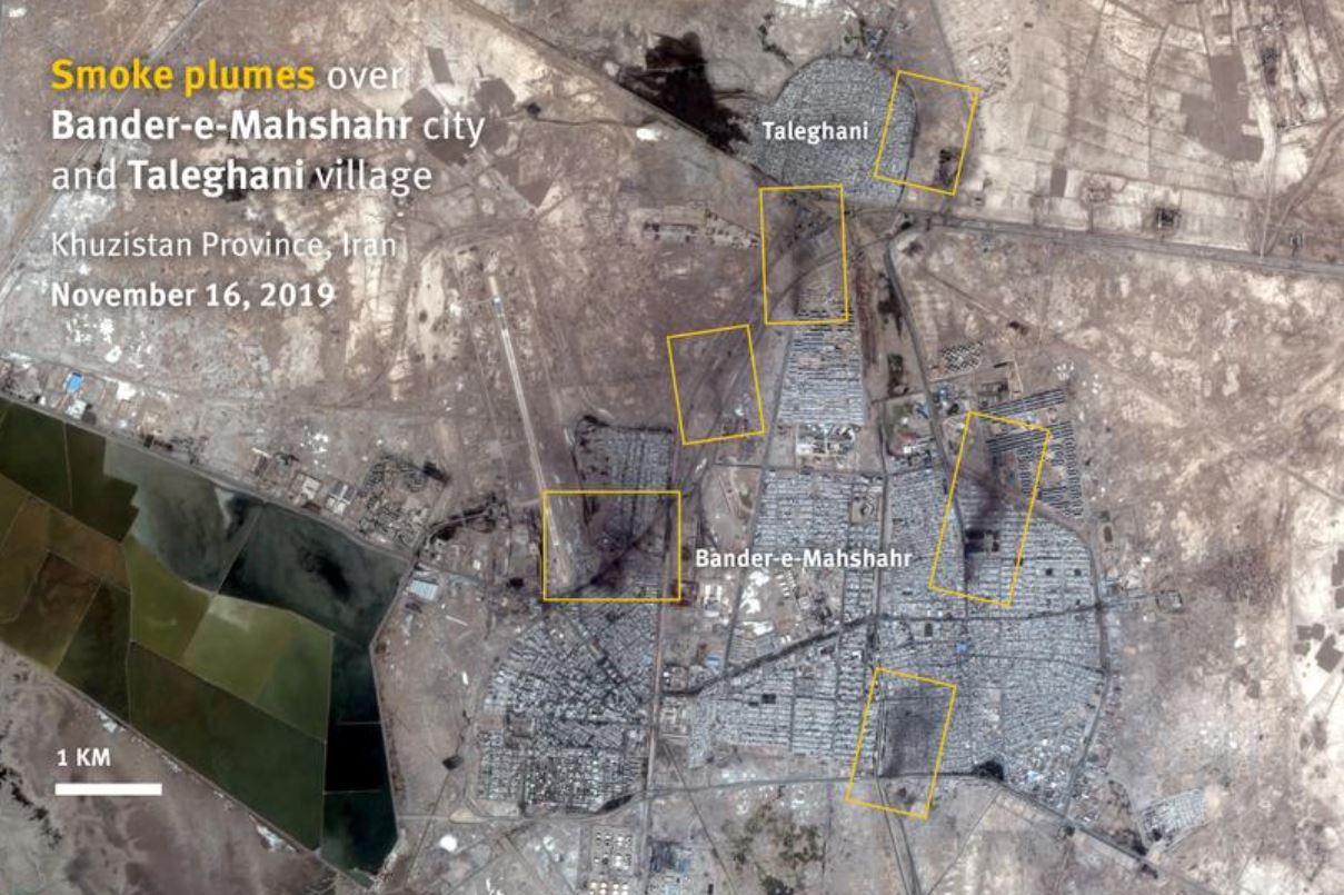 تصاویر ماهوارهای ضبطشده در صبح ۱۶ نوامبر حداقل ۸ ستون دود برخاسته از خیابانهای بندر ماهشهر و طالقانی را نشان میدهد که مطابق با آتش زدن تایرها و دیگر مواد از سوی معترضان است.