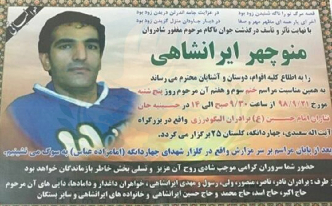بنقل از یک منبع مطلع در گفتگو با گزارشگر حقوق بشر در ایران ضمن اعلام این خبر گفت؛ در سال ۱۳۸۸ “منوچهر ایرانشاهی”, به اتهام قتل بازداشت شد و پس از طی مراحل دادرسی از سوی دادگاه و سپس دیوان عالی کشور حکم اعدام وی به تائید رسید و پس از مدتی با مساعدت از سوی نزدیکان و دوستانش موفق به کسب رضایت از اولیای دم مقتول شده بود.