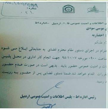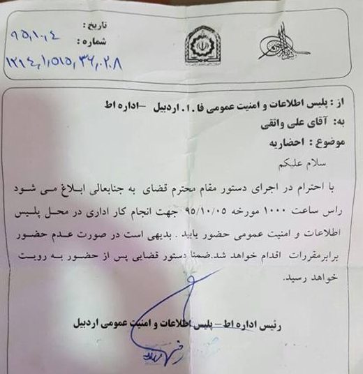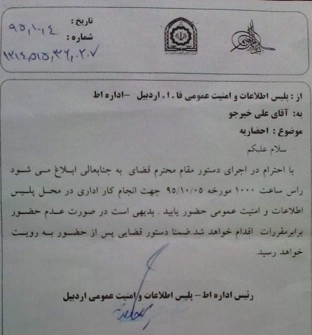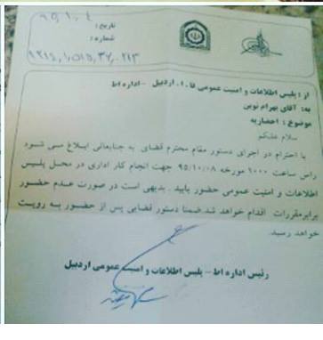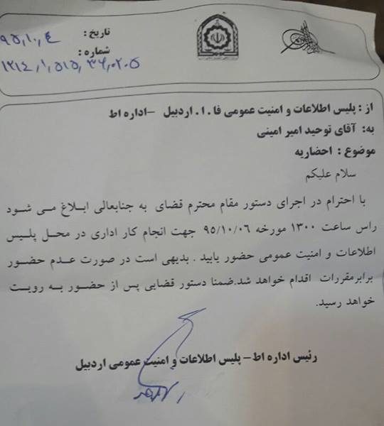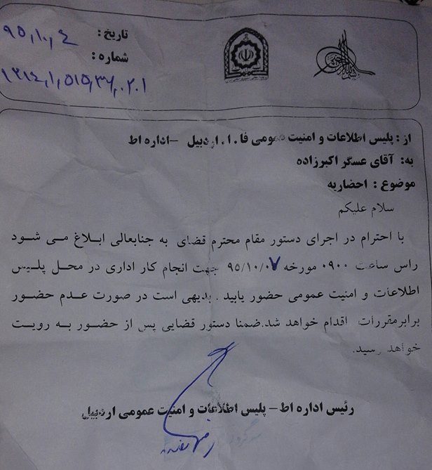 به گزارش حقوق بشر در ایران، طی روزهای اخیر پلیس امنیت و اداره ی اطلاعات با تماس تلفنی و مراجعه به درب منازل و محل کار فعالین مدنی در شهر اردبیل خواستار حضور آنان در این اماکن بودند؛ با امتناع این فعالین از حضور به دلیل غیر قانونی بودن این احضار ها، اداره اطلاعات و پلیس امنیت اقدام به احضار فعالین از طریق احضاریه کتبی کرده است.