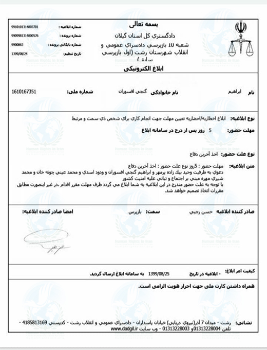 حقوق بشر در ایران – امروز سه شنبه ۲۷ آبان ماه ۱۳۹۹، شعبه ۱۰ بازپرسی دادسرای عمومی و انقلاب شهرستان رشت – مرکز استان گیلان، با ارسال ابلاغیه ای ۵ تن از فعالان ملی مدنی آذربایجانی را فراخواند.