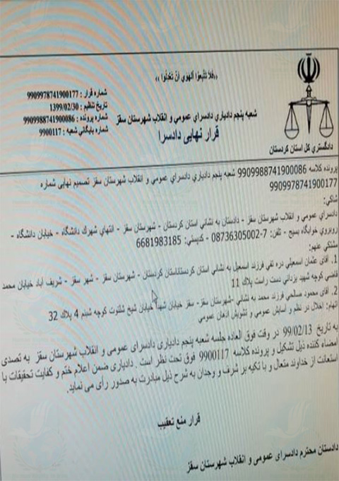 براساس رای دادنامه صادره از سوی شعبه ۵ دادسرای عمومی و انقلاب سقز: “محمود صالحی و عثمان اسماعیلی با اتهامات اخلال در نظم و آسایش عمومی و تشویش اذهان عمومی در پی شکایت اداره اطلاعات سقز تحت تعقیب قضای قرار گرفته بودند که این اتهامات پس از تحقیق توسط شعبه ۵ بازپرسی دادسرای عمومی و انقلاب سقز با استناد به ماده ٢۶۵ قانون آیین دادرسی کیفری مصوب سال ۱۳۹۲ و اصطلاحات بعدی قرار منع تعقیب را برای این ۲ فعال کارگری صادر کرد”.