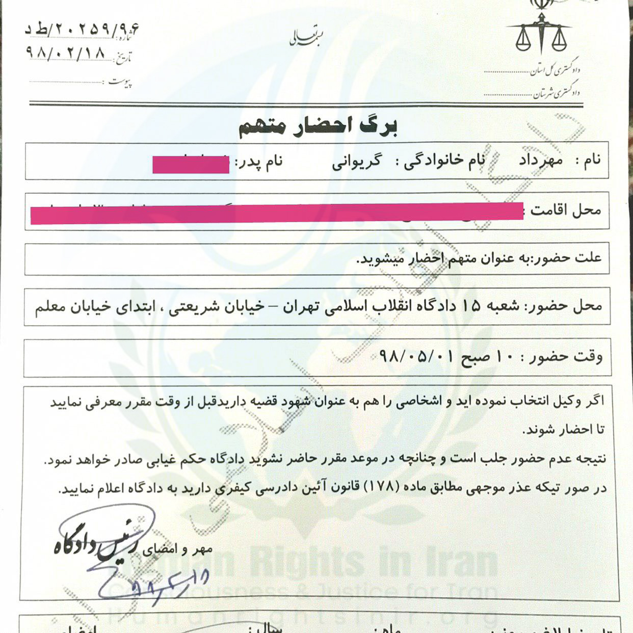 حقوق بشر در ایران – “مهرداد گریوانی”، فعال مدنی، ساکن تهران با توجه به ابلاغیه دریافتی از سوی شعبه ۱۵ دادگاه انقلاب تهران به ریاست “ابوالقاسم صلواتی” به تاریخ رسیدگی ۱ مرداد ماه سالجاری احضار شد.