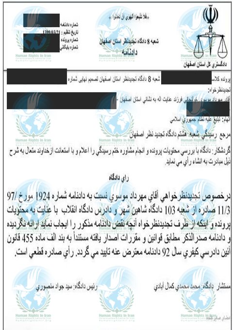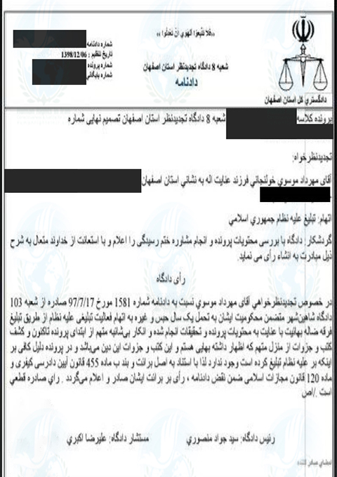 حقوق بشر در ایران – امروز یکشنبه ۲۵ خرداد ماه ۱۳۹۹, شعبه ۸ دادگاه تجدیدنظر استان اصفهان به مستشاری دادگاه محمد محمدی کمال آبادی و ریاست قاضی جواد منصوری با صدور دادنامه ای مهرداد موسوی خولنجانی, شهروند بهائی ساکن شاهین شهر اصفهان را به تحمل ۶ ماه حبس تعزیری محکوم کرد.