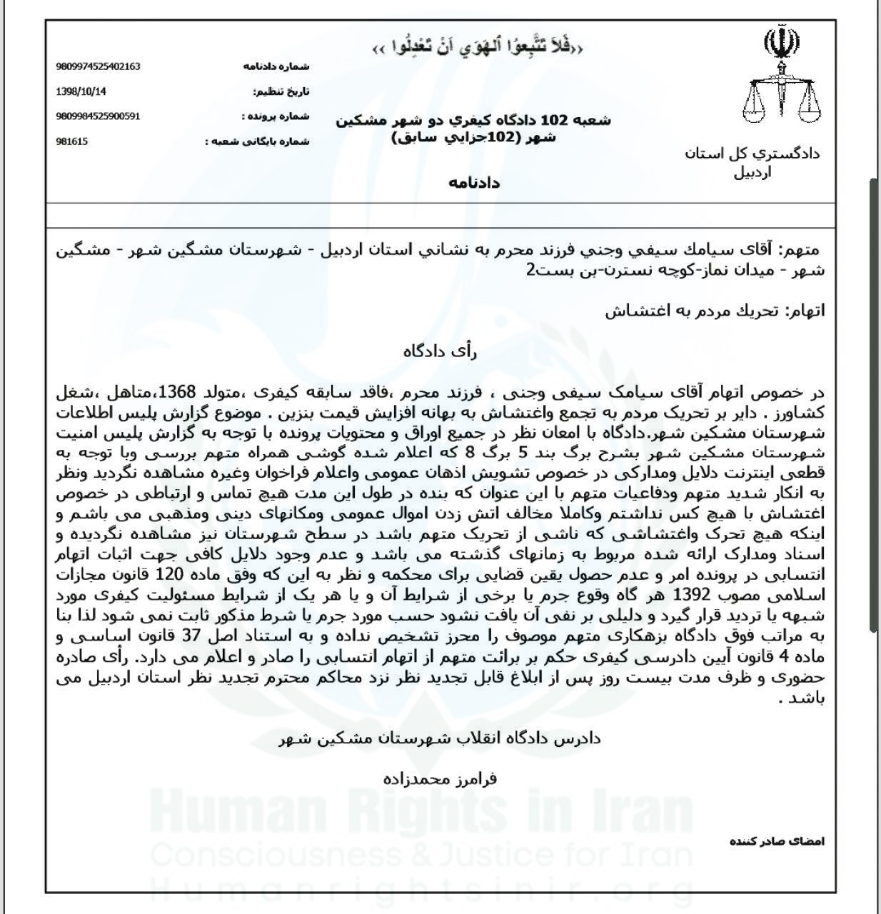 به گزارش حقوق بشر در ایران, روز شنبه ۱۴ دی ماه ۱۳۹۸, سیامک سیفی, فعال ملی مدنی اهل شهرستان خیاو « مشگین شهر », که در جریان تجمعات اعتراضی آبان ماه سالجاری توسط ماموران امنیتی بازداشت و از بابت اتهام “تحریک و تشویق سایر شهروندان به اغتشاش” از سوی شعبه ۱۰۲ دادگاه کیفری ۲ شهرستان مشکین شهر به ریاست قاضی “فرامرز محمدزاده” مورد محاکمه قرار گرفته بود از اتهام فوق تبرئه و حکم صادره روز جاری به این فعال ملی مدنی ابلاغ شد.