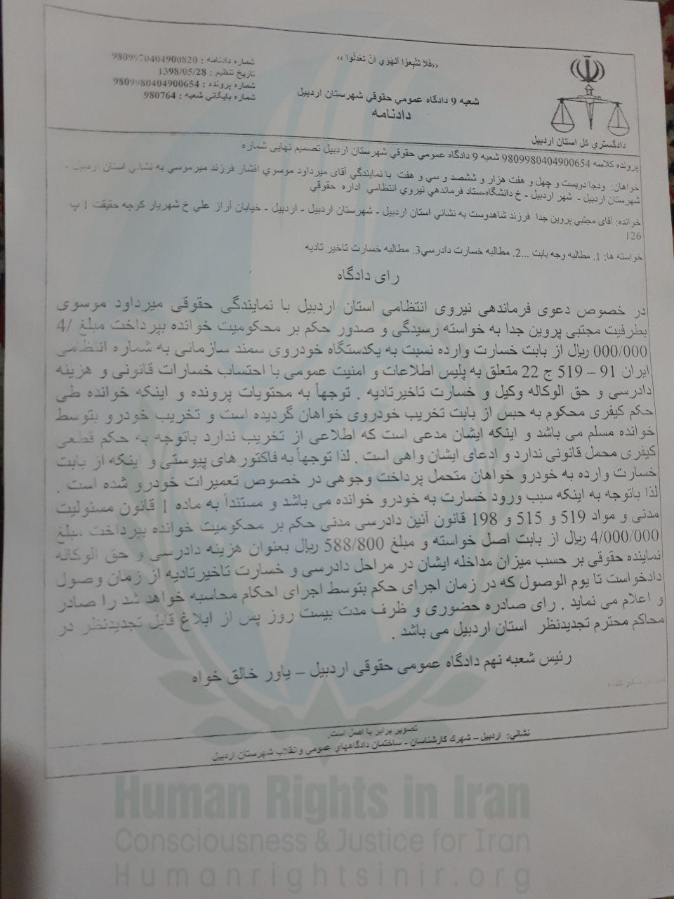 همچنین در این دادنامه آمده بود که “این حکم با شکایت نیروی انتظامی و بر اساس گزارش مدیر کل اطلاعات استان اردبیل و اداره اطلاعات پلیس اطلاعات و امنیت عمومی فرماندهی استان اردبیل صادر شده است.“
