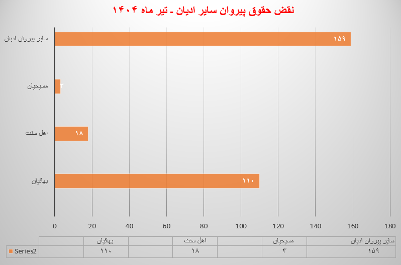 حقوق بشر در ایران ـ گزارش پیش رو شامل اطلاعات آماری از نقض حقوق پیروان سایر ادیان در ایران، تا پایان تیر ماه ۱۴۰۴ است. این گزارش به صورت آماری – تحلیلی ارائه میشود، مسلماً به دلیل عدم اجازه دولت ایران به مدافعان حقوق بشر جهت فعالیت به خصوص در حوزه گزارشگری، نقض حقوق بشر و همین طور ممانعت از گردش آزاد اطلاعات و به رسمیت نشناختن حوزه مستقل در فعالیتهای مدنی از سوی دولت ایران، در حال حاضر مسئله گزارشگری، امری دشوار و خطیر با محدودیتهای فراوان است.