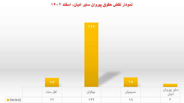 حقوق بشر در ایران ـ گزارش پیش رو دربردارنده اطلاعات آماری از نقض حقوق پیروان سایر ادیان در ایران، تا پایان اسفند ماه ۱۴۰۲ است. این گزارش به صورت آماری – تحلیلی ارائه میشود، مسلماً به دلیل عدم اجازه دولت ایران به مدافعان حقوق بشر جهت فعالیت به خصوص در حوزه گزارشگری، نقض حقوق بشر و همین طور ممانعت از گردش آزاد اطلاعات و به رسمیت نشناختن حوزه مستقل در فعالیتهای مدنی از سوی دولت ایران، در حال حاضر مسئله گزارشگری، امری دشوار و خطیر با محدودیتهای فراوان است. این گزارش، با توجه به اخباری که توسط فعالان حقوق بشر و یا از طریق سایر رسانه های مورد تائید حقوق بشر در ایران، منتشر شده تنظیم گردیده است و آمار و ارقام از نقض حقوق پیروان سایر ادیان به مراتب بیش از این تعداد است.