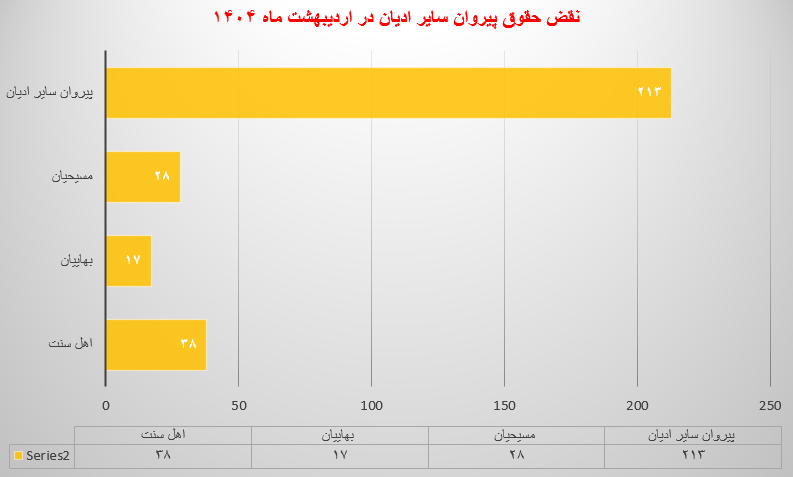 حقوق بشر در ایران ـ گزارش پیش رو شامل اطلاعات آماری از نقض حقوق پیروان سایر ادیان در ایران، تا پایان اردیبهشت ماه ۱۴۰۴ است. این گزارش به صورت آماری – تحلیلی ارائه میشود، مسلماً به دلیل عدم اجازه دولت ایران به مدافعان حقوق بشر جهت فعالیت به خصوص در حوزه گزارشگری، نقض حقوق بشر و همین طور ممانعت از گردش آزاد اطلاعات و به رسمیت نشناختن حوزه مستقل در فعالیتهای مدنی از سوی دولت ایران، در حال حاضر مسئله گزارشگری، امری دشوار و خطیر با محدودیتهای فراوان است.