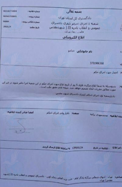 در تاریخ ۲ مهر ماه ۱۳۹۸, طی تماس تلفنی که از سوی دفتر شعبه ۲۶ دادگاه انقلاب تهران با وثیقه گذار “ناهید خداجو” گرفته شده بود این فعال کارگری به دفتر شعبه مذکور احضار شد و سپس تاریخ ۱۰ مهر ماه ۱۳۹۸, پس از حضور ناهید خداجو در محل دفتر شعبه مذکور به این فعال کارگری ابلاغ شده بود.