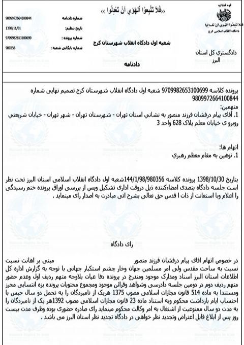 به گزارش حقوق بشر در ایران, امروز شنبه ۲۰ اردیبهشت ماه ۱۳۹۹, پیام درفشان, وکیل دادگستری و فعال حقوق بشر توسط شعبه ۱ دادگاه انقلاب کرج به ریاست قاضی عاصف الحسینی, از بابت اتهام توهین به رهبری به تحمل ۲ سال حبس تعزیری و ۲ سال محرومیت از وکالت محکوم شد. پیام درفشان در سال ۱۳۹۷ توسط نیروهای امنیتی بازداشت و پس از طی مراحل بازجوئی با تودیع قرار وثیقه و بطور موقت آزاد شد. تاریخ صدور این حکم مربوط به ۱ بهمن ماه ۱۳۹۸ است.