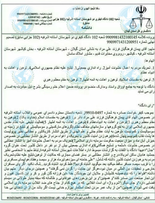 به گزارش حقوق بشر در ایران، روز چهارشنبه ۲ مهر ماه ۱۳۹۹، پیمان فرهنگیان، فعال ادبی و کارگر ساکن بندر کیاشهر، توسط شعبه ۱۰۲ دادگاه کیفری ۲ شهرستان آستانه اشرفیه بدون تشکیل جلسه دادرسی بصورت غیابی به ریاست قاضی سید صادق حسینی با اتهامات توهین به مقدسات اسلام، توهین و اهانت به انبیا و توهین و اهانت به ائمه، توهین به روح الله خمینی، توهین به رهبری، توهین به مسئولان نظام از طریق انتشار کاریکاتور از احمد جنتی و احمد علم الهدی » در فضای مجازی، فعالیت تبلیغی علیه نظام و به نفع گروههای مخالف نظام « گروههای مارکسیستی و سوسیالیستی »، فعالیت تبلیغی علیه نظام، تبلیغ به نفع سازمانهای مخالف نظام « سوسیالیست و کمونیست »، تحریک و اغوای مردم از طریق انتشار مطالبی در خصوص خیزش آبان ماه و میزان سبعیت حکومت سرمایه داری اسلامی به قصد بر هم زدن امنیت کشور، تحریک مردم به اعمال خشونت آمیز با انتشار مطالبی در خصوص خشونت، اسلحه و تسلیح همگانی، راه اندازی جمعیتی بیش از ۲ نفر در داخل کشور در شبکه اجتماعی سیگنال به قصد بر هم زدن امنیت کشور، در مجموع به تحمل ۳۸ سال حبس تعزیری و بعنوان مجازات تکمیلی هم به تحمل ۱ سال شرکت اجباری در ۱ دوره کلاسهای آموزش علوم، اعتقادات و معارف دینی محکوم شد.