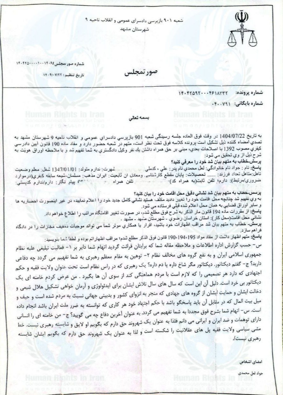 براساس صورت جلسه تنظیم شده توسط بازپرس شعبه ۹۰۱ دادسرای عمومی و انقلاب مشهد، جواد لعل محمدی با اتهاماتی از قبیل «فعالیت تبلیغ علیه نظام به نفع گروههای مخالف نظام» و «توهین به رهبری» تفهیم اتهام شده است.