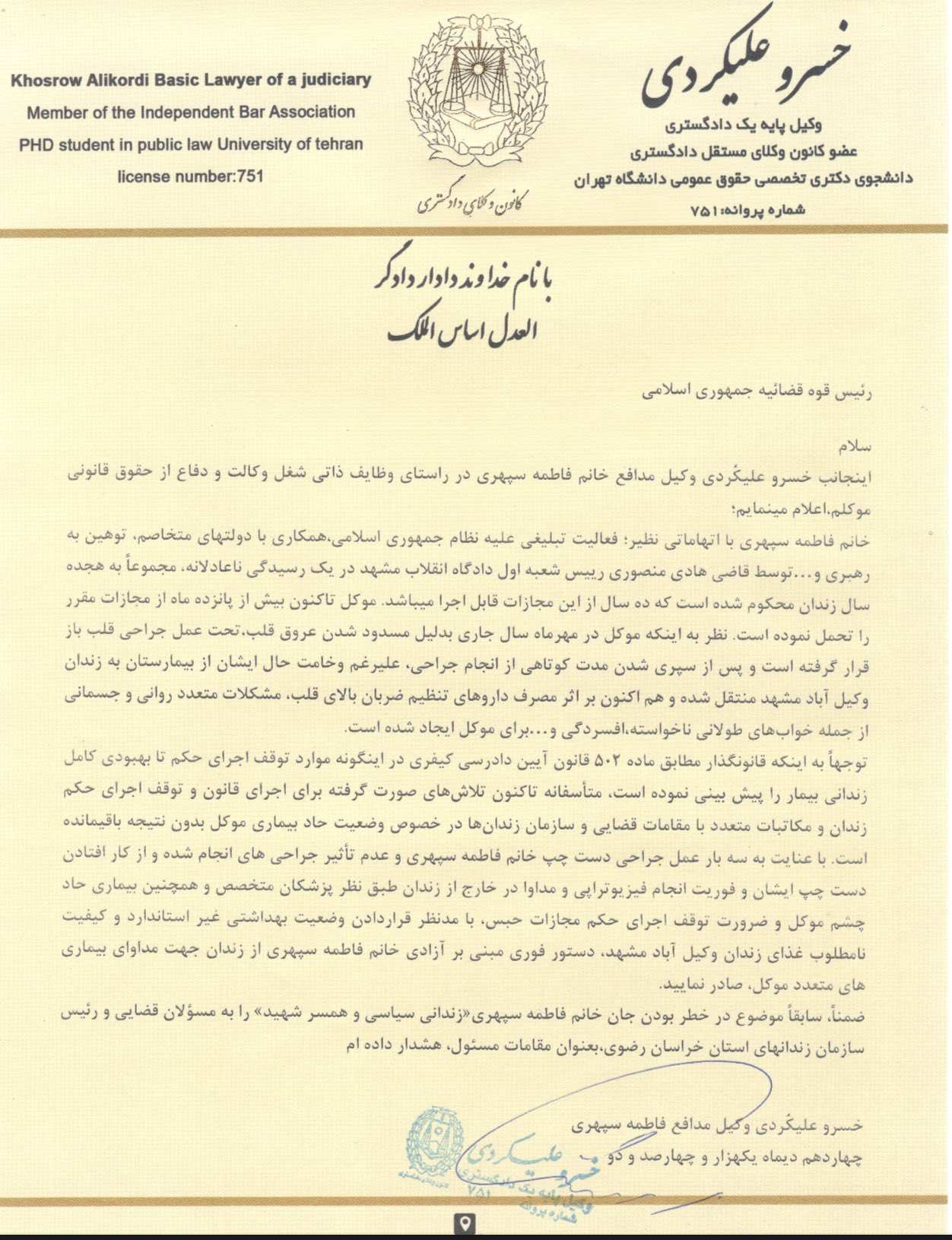 خسرو علیکُردی، وکیل دادگستری، با انتشار نامه ای خطاب به غلامحسین محسنی اژه ای ـ رئیس قوه قضائیه ضمن تاکید بر (حاد) بودن وضعیت جسمانی موکل خود تشریح کرد:”نظر به اینکه موکل بنده به علت مسدود بودن عروق قلب، تحت عمل جراحی قلب باز قرار گرفته است و پس از سپری شدن مدت کوتاهی از عمل جراحی به زندان بازگردانده شد هم اکنون بر اثر مصرف داروهای تنظیم ضربان قلب، مشکلات متعدد روانی و جسمانی، از جمله خوابهای طولاین و افسردگی، برای موکل بنده ایجاد شده است. با توجه به اینکه قانون گذار، با استناد به ماده ۵۰۲ قانون آئین دادرسی کیفری، در اینگونه موارد توقف اجرای حکم تا زمان بهبهودی بیماری زندانی را پیش بینی کرده ولی متاسفانه با وجود تلاشهای صورت گرفته برای اجرای قانون و توقف اجرای حکم زندان و مکاتبات متعدد با مقامات قضایی و سازمان زندانها در خصوص وضعیت حاد بیماری موکل بنده ـ خانم فاطمه سپهری، بدون نتیجه باقی مانده است. با عنایت به ۳ مرحله عمل جراحی بروری دست خانم سپهری و عدم تاثیر جراحی های انجام شده و از کار افتادن دست چپ وی و فوریت انجام فیریوتراپی و مداوا در خارج از زندان و بر طبق نظر پزشکان متخصص و همچنین بیماری حاد چشمی موکل بنده و ضرورت دستور برای اجرای حکم مجازات حبس، با مدنظر قراردادن وضعیت غیربهداشتی و کیفیت نامطلوب غذای زندان وکیل آباد مشهد دستور فوری مبنی بر آزادی خانم فاطمه سپهری برای انجام مداوای بیماریهای متعدد وی را صادر کنید.”