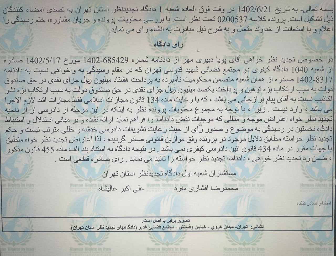 به گزارش حقوق بشر در ایران، روز سه شنبه ۲۱ شهریور ماه ۱۴۰۲، پویا دبیری مهر، روزنامه نگار ـ فعال رسانه ای، ساکن تهران، توسط مستشاران ـ محمدرضا افشاری مفرد و علی اکبر عالیشاه شعبه یک دادگاه تجدیدنظر استان تهران به پرداخت ۳۰ میلیون تومان جریمه نقدی، محکوم شد.