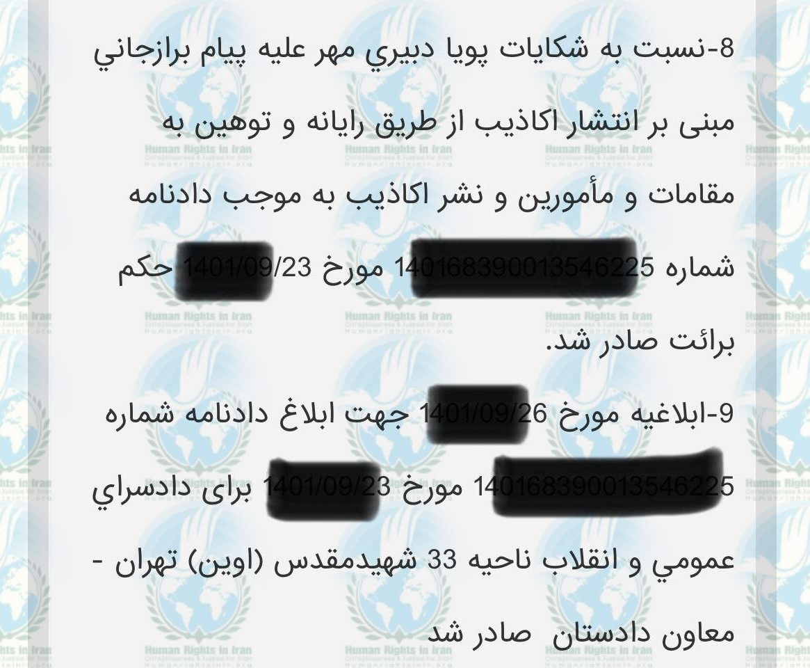 حقوق بشر در ایران – امروز یکشنبه ۶ اسفند ماه ۱۴۰۲، پویا دبیری مهر، توسط قاضی شعبه دادگاه تجدیدنظر استان تهران به پرداخت جریمه نقدی محکوم شد.