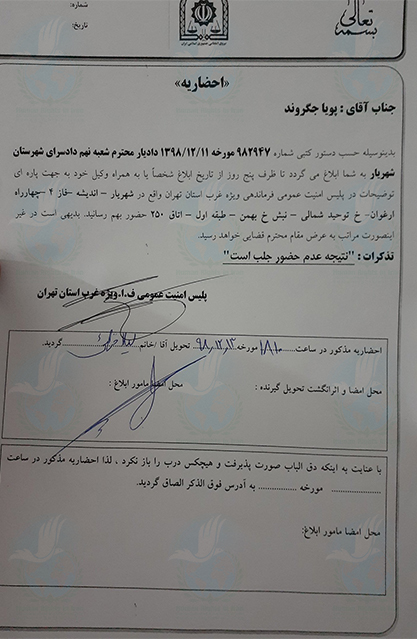 به گزارش حقوق بشر در ایران, روز یکشنبه ۱۱ اسفند ماه ۱۳۹۸, شعبه ۹ دادیاری دادسرای عمومی و انقلاب شهرستان شهریار با صدور و ابلاغ احضاریه ای کتبی, پویا جگروند, فعال مدنی ساکن شهرک وحیدیه از توابع شهرستان شهریار را به مقر پلیس امنیت عمومی غرب استان تهران واقع در شهرک اداری شهرستان شهریار احضار کرد.