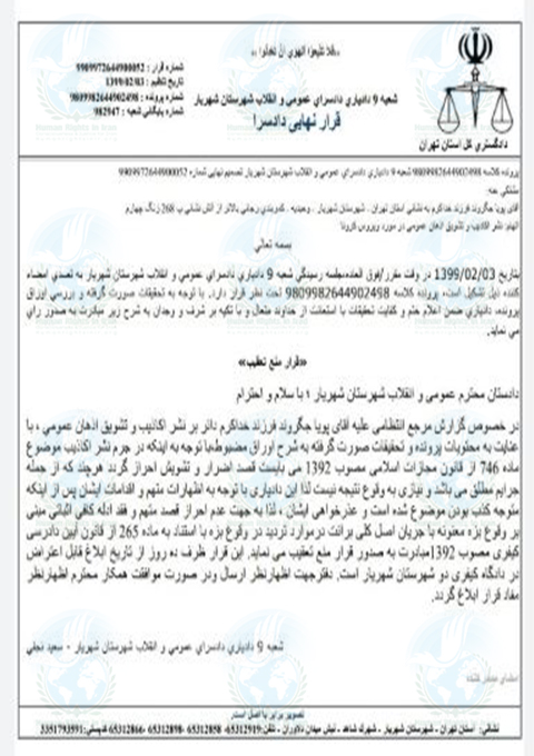 حقوق بشر در ایران – امروز جمعه ۹خرداد ماه ۱۳۹۹, بازپرس شعبه ۹ دادیاری دادسرای عمومی و انقلاب شهرستان شهریار قرار منع تعقیب پویا جگروند, فعال مدنی ساکن این شهرستان را صادر و به وی ابلاغ کرد.