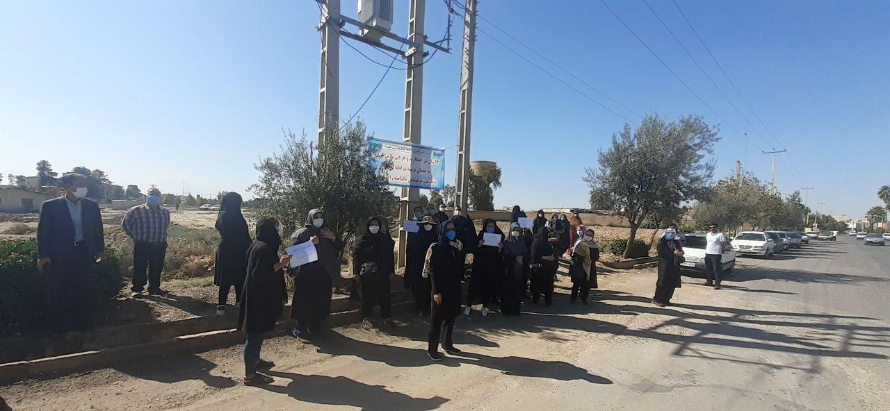 فرهنگیان معترض با در دست داشتن بنر و دست نوشته هایی خواستار پیگیری موضوع مسکن معلمان شهرستان و پایان دادن به مساله اختلافی بین مالکان خصوصی و دولتی شدند.